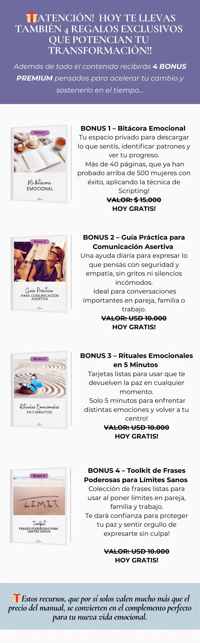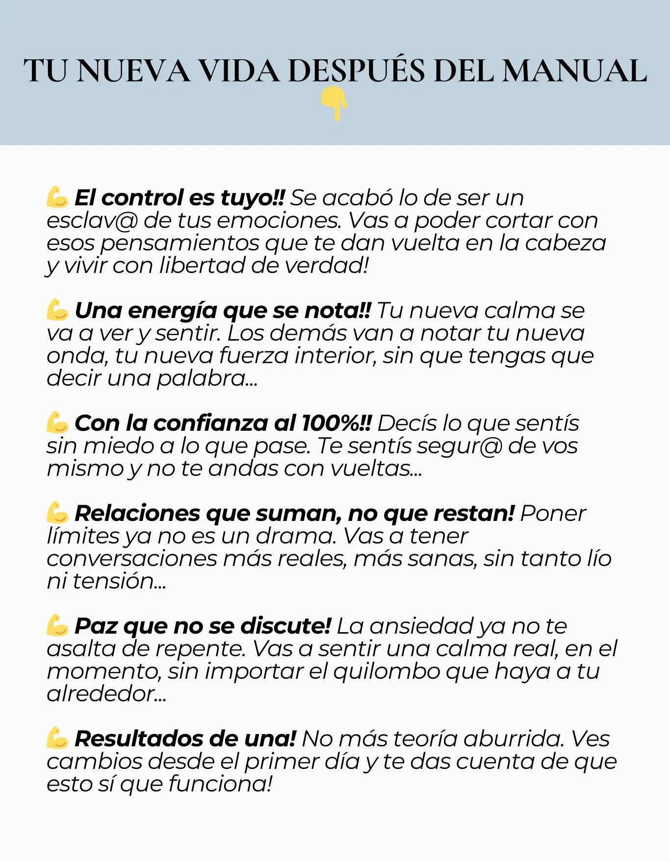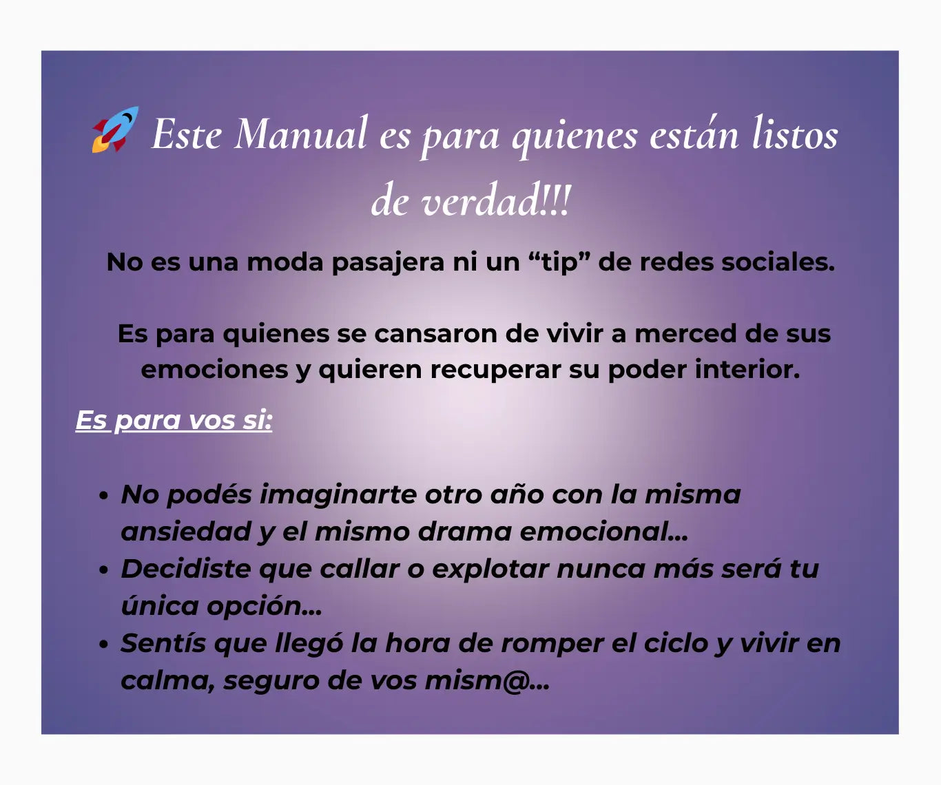 No. El Manual es una herramienta de autoconocimiento y trabajo interno. Si necesitás atención clínica, te recomendamos siempre acompañarlo con un profesional de la salud.